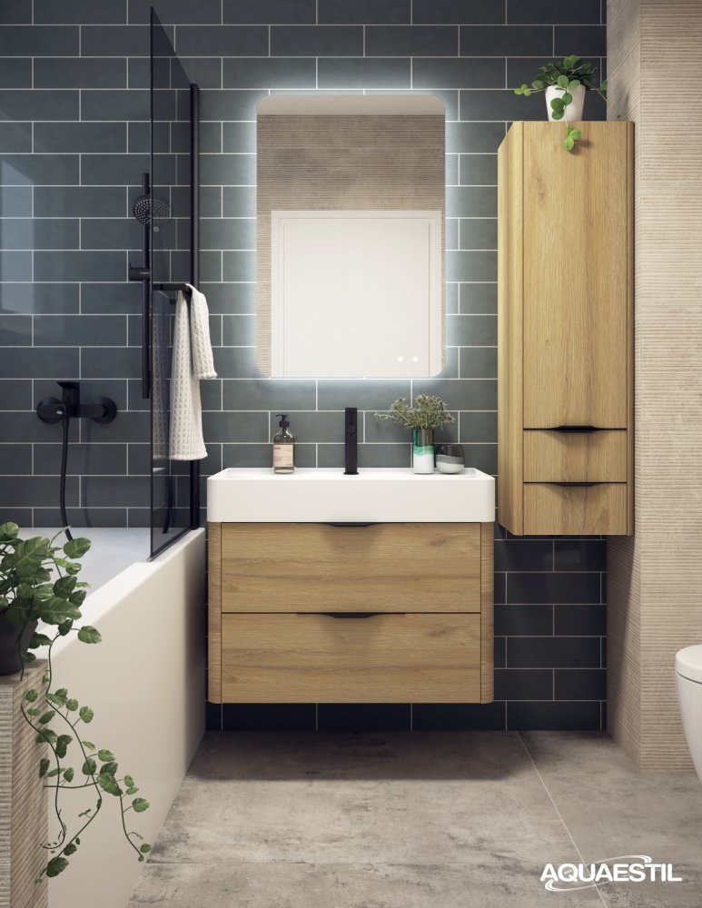 Das Material der Aquaestil Badezimmermöbel ist feuchtigkeitsbeständig, aber nicht vollständig wasserfest. Langfristige Exposition gegenüber hohen Feuchtigkeits- und Wasserwerten kann zu einem Aufquellen der Kanten der Holzbestandteile und zu einer möglichen Korrosion der Spiegel führen.