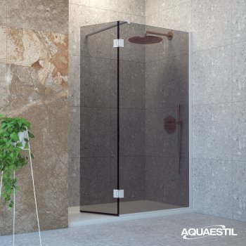 Eine Duschwand, der aus einer festen Glaswand und einem um 180° drehbaren Drehteil mit drei Stopppunkten.