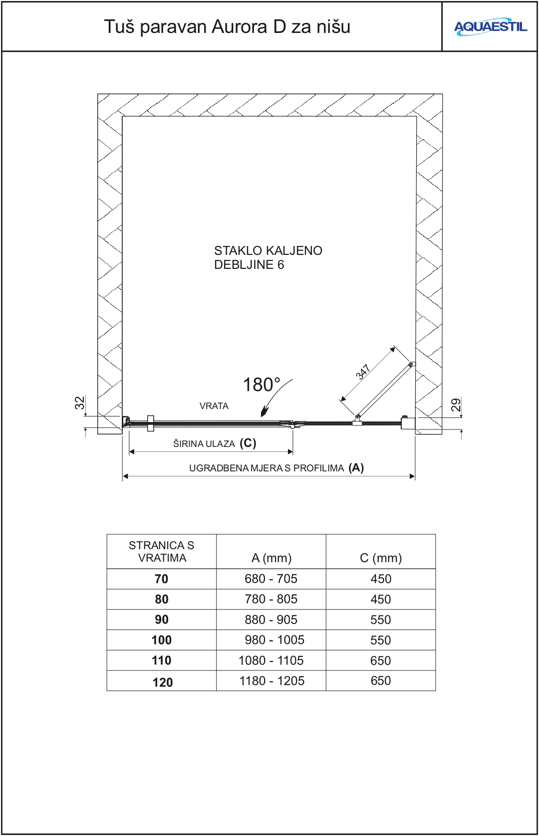 Aurora D za nišu je moderan stakleni paravan s okretnim vratima namijenjen prostorima za tuširanje koji se nalaze između tri zida. Paravan se sastoji od kraće fiksne stijene i okretnih vrata koja se otvaraju prema van. Aurora je opremljena kaljenim staklom debljine 6 mm, kvalitetnim magnetnim brtvama i zaštitnom letvicom na spoju tuš kade i vrata. Vrata ovog paravana imaju lift sistem koji omogućuje lako otvaranja bez struganja po tuš kadi.