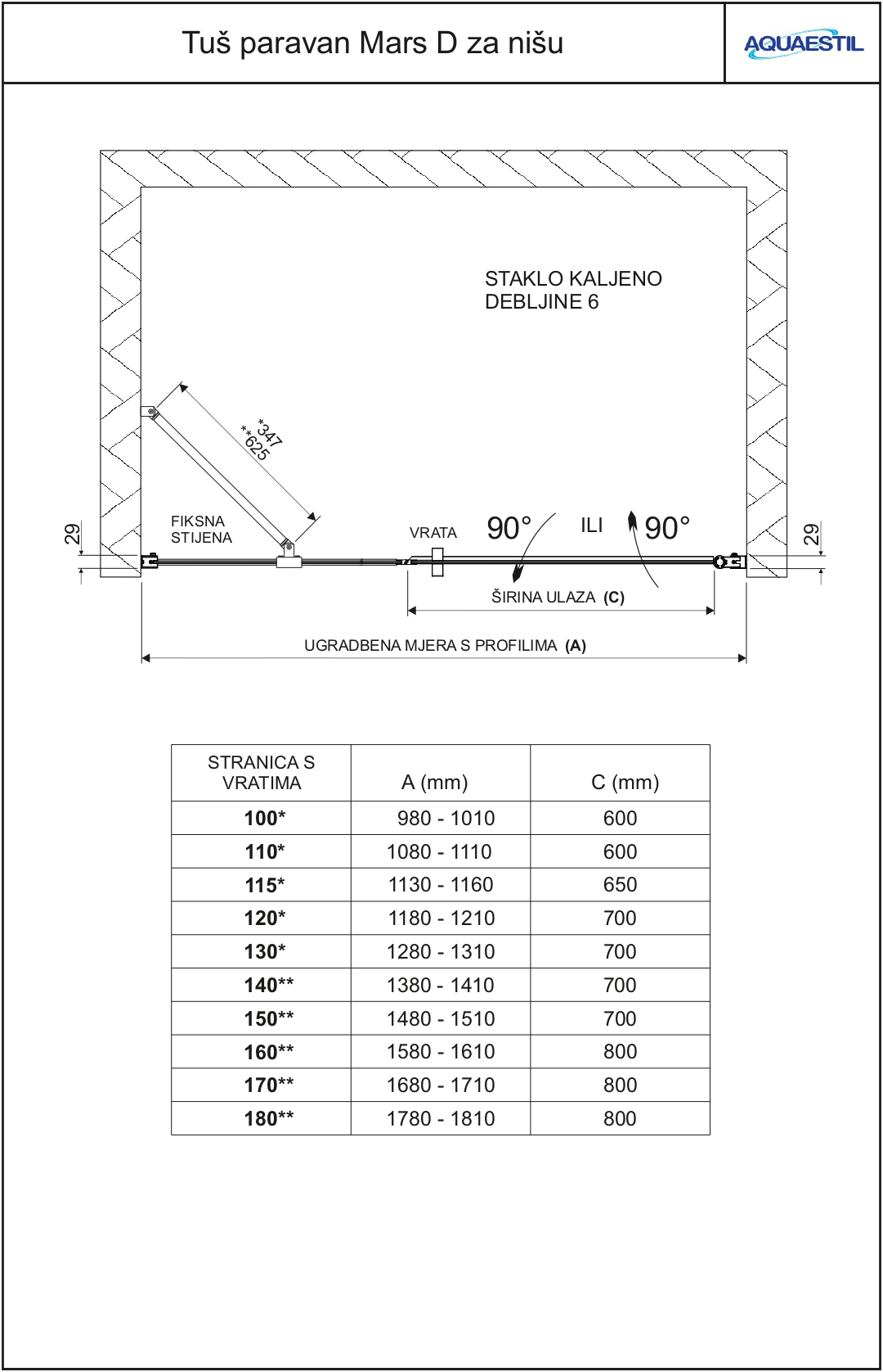 Mars D za nišu je kvalitetan paravan koji je namijenjen ugradnji između 3 zida (u nišu), a sastoji se od jedne fiksne stijene i okretnih vrata. Paravan je opremljen elegantnim, u presjeku okruglim profilima i 6 mm kaljenim staklom koje je tvornički tretirano nano-nanosom protiv kamenca. Kod naručivanja paravana s reljefnim staklom, potrebno je definirati smjer otvaranja vrata (L ili D). Prilikom montaže paravana moguće je podesiti smjer otvaranja vrata (prema unutra ili prema van).