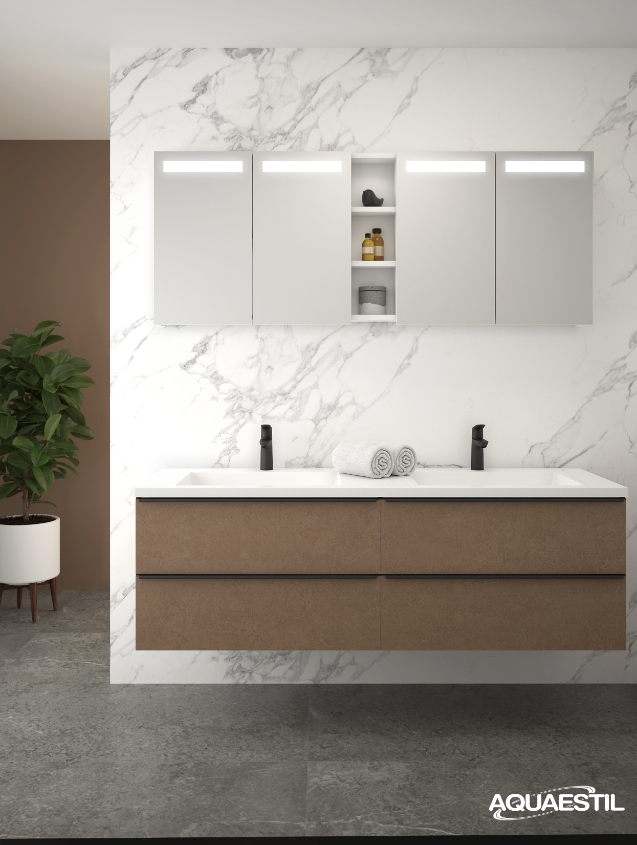Il materiale dei mobili da bagno Aquaestil è resistente all'umidità, ma non completamente impermeabile. L'esposizione prolungata a livelli elevati di umidità e acqua può causare il rigonfiamento dei bordi delle parti in legno dei mobili e la possibile corrosione degli specchi.