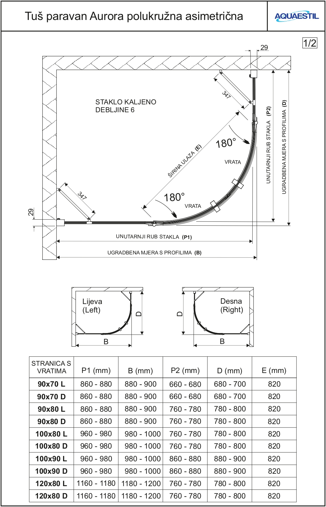 Die asymmetrische halbrunde Version des modernen Aurora-Glasschirms ist für die Montage auf der halbrunden asymmetrischen Version der flachen Teso-Duschwanne oder auf Keramikfliesen vorgesehen. ESG 6 mm starke Karusselltüren mit Liftsystem und hochwertigen Magnetdichtungen sowie eine Schutzleiste am Übergang von Tür und Dusche sorgen für höchste Funktionalität.