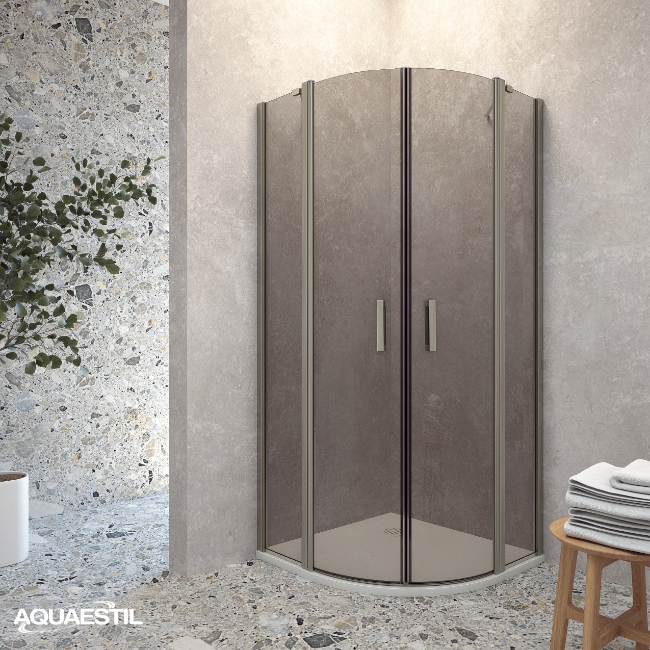 A modern semicircular shower enclosure consisting of two "D" panels with doors. Each panel consists of a hinged door and a fixed section. The enclosure features elegant profiles available in silver, black matte, or white matte finishes and 6 mm tempered glass with a factory-applied anti-scale nano-coating. Magnetic seals and a lift door system ensure excellent functionality and splash protection.