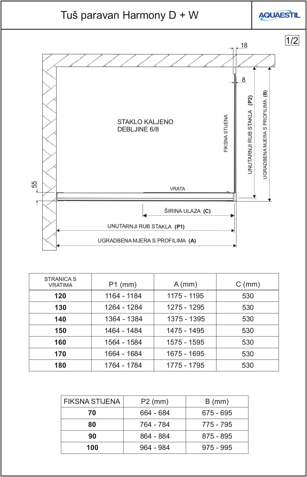 Harmony D+W is an elegant sliding-door shower enclosure with a standard height of 210 cm, equipped with a concealed soft-close system and a door separation system for easier cleaning and maintenance. The design of Harmony shower screens incorporates advanced features with minimal use of profiles. The D+W variant consists of a side with a door and a fixed wall.