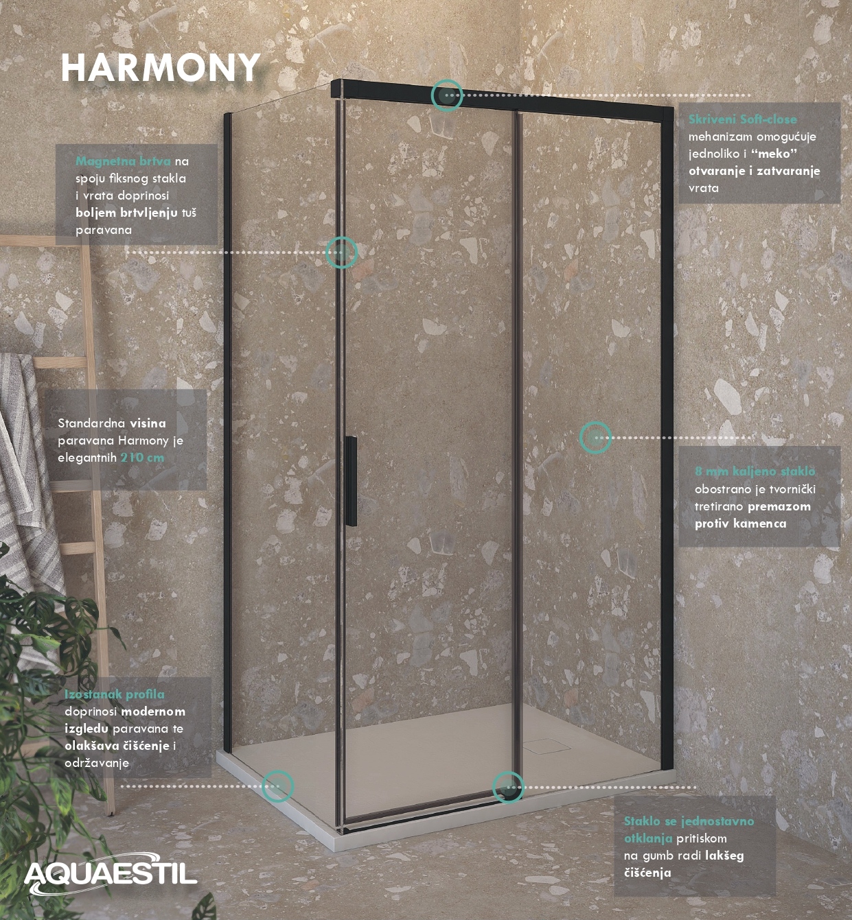By combining the advantages of 8 mm tempered glass for fixed parts and 6 mm for movable parts of the shower screen, Harmony offers exceptional strength and stability while ensuring remarkable ease of door operation.