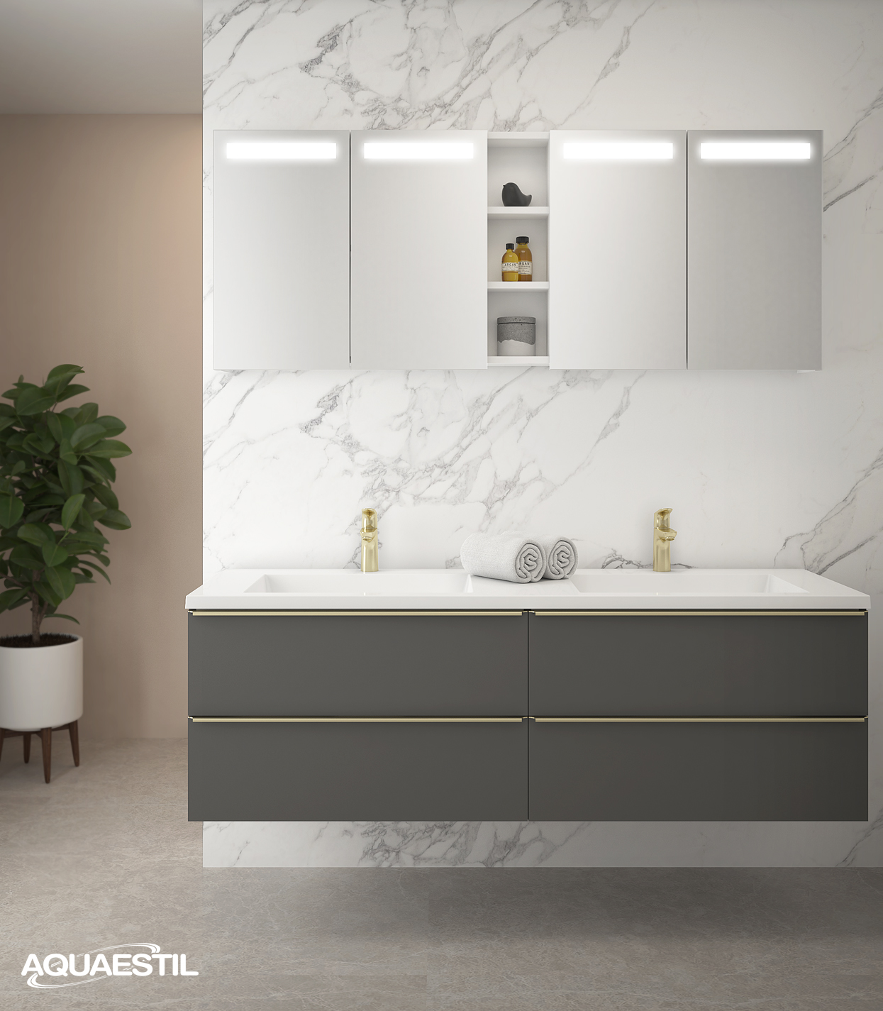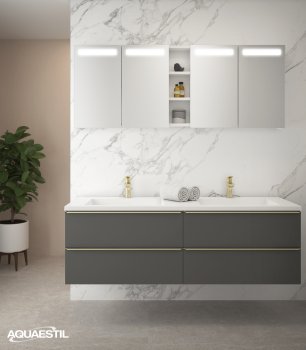 - Boje prezentirane na web stranici mogu u manjoj mjeri odstupati u odnosu na stvarne boje kupaonskog namještaja. Uzorci boja namještaja mogu se vidjeti uživo kod ovlaštenih Aquaestil maloprodajnih partnera ili u našem izložbenom salonu.
