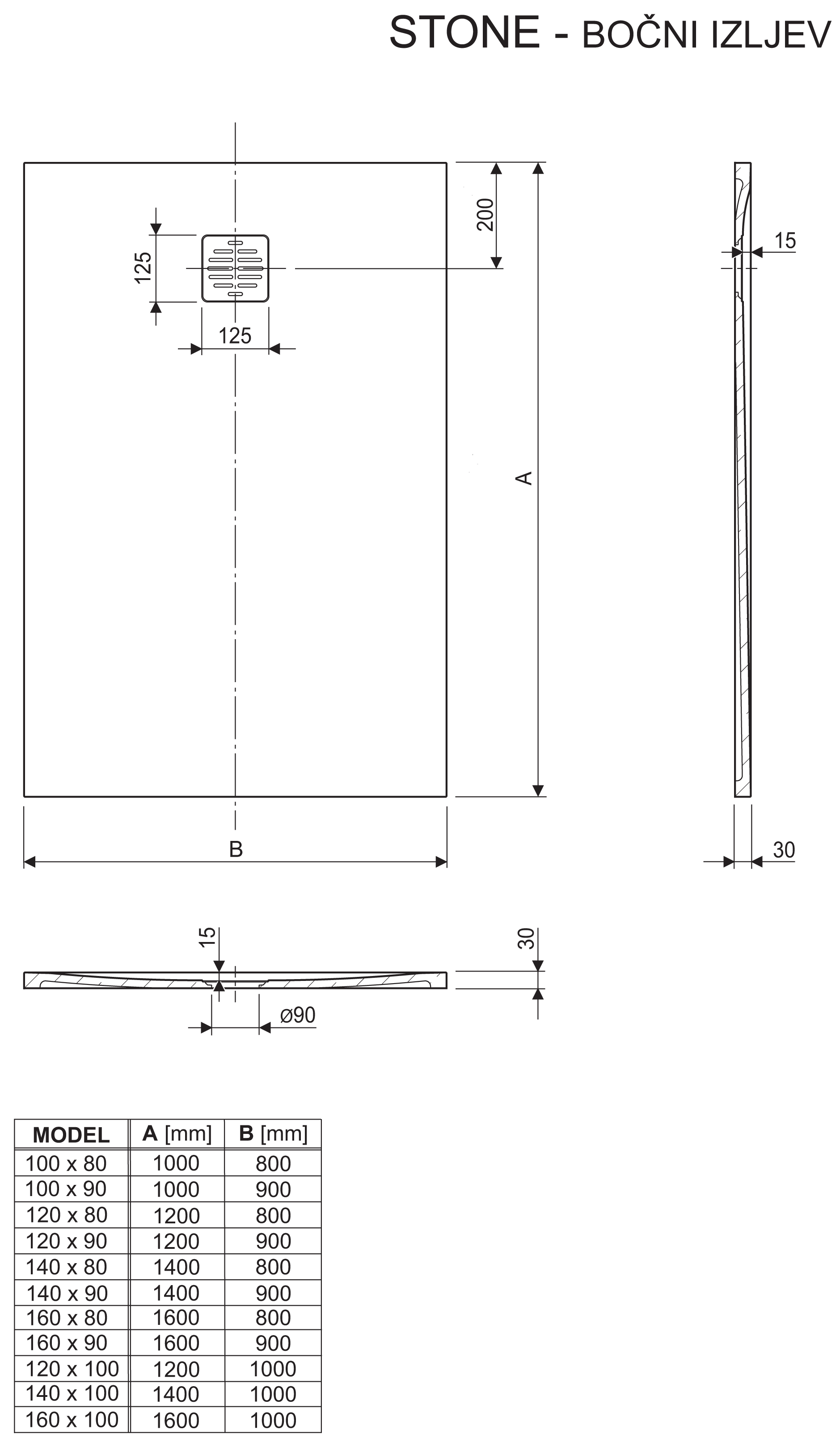 - Verificare la posizione del sifone per ciascuna delle dimensioni del piatto doccia rettangolare Stone sui disegni nel capitolo "informazioni tecniche".