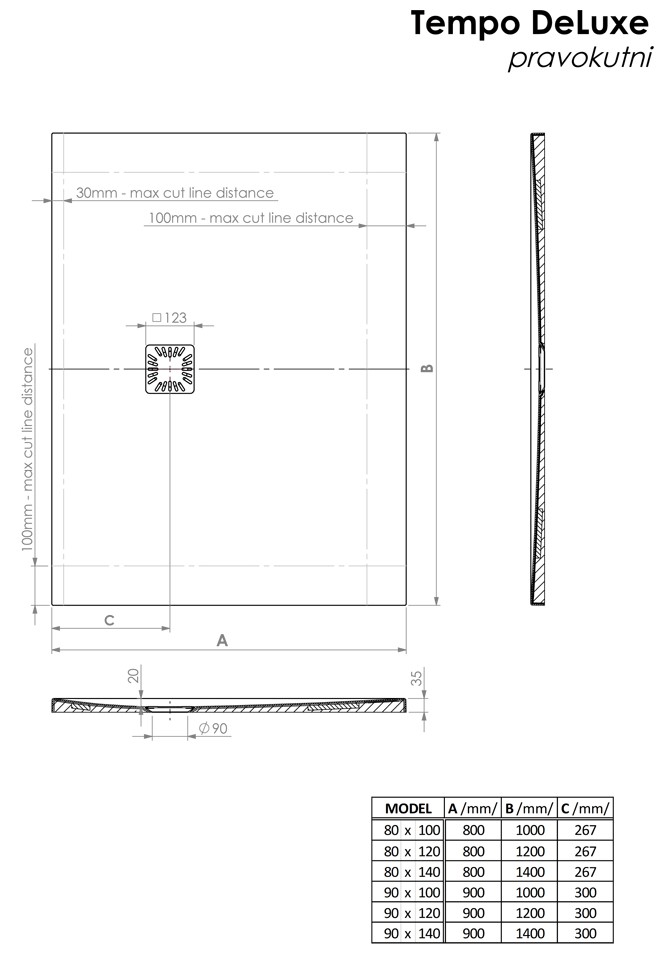 - Il piatto doccia Tempo DeLuxe può essere tagliato entro determinate dimensioni. Quando si ordina il taglio di fabbrica, è necessario allegare uno schizzo con linee di taglio contrassegnate.