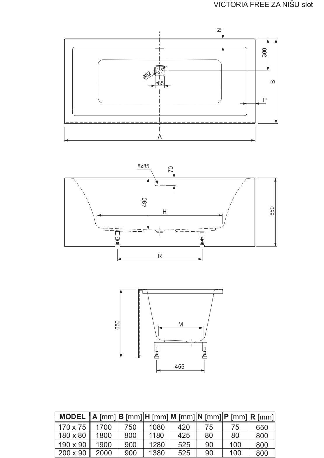 Victoria Free è un'elegante e moderna vasca rettangolare con piedistallo integrato e pannelli collegati senza soluzione di continuità. La vasca viene consegnata con un telaio montato in fabbrica e un set troppopieno-scarico con troppopieno "slot" e valvola sifone "click-clack".
