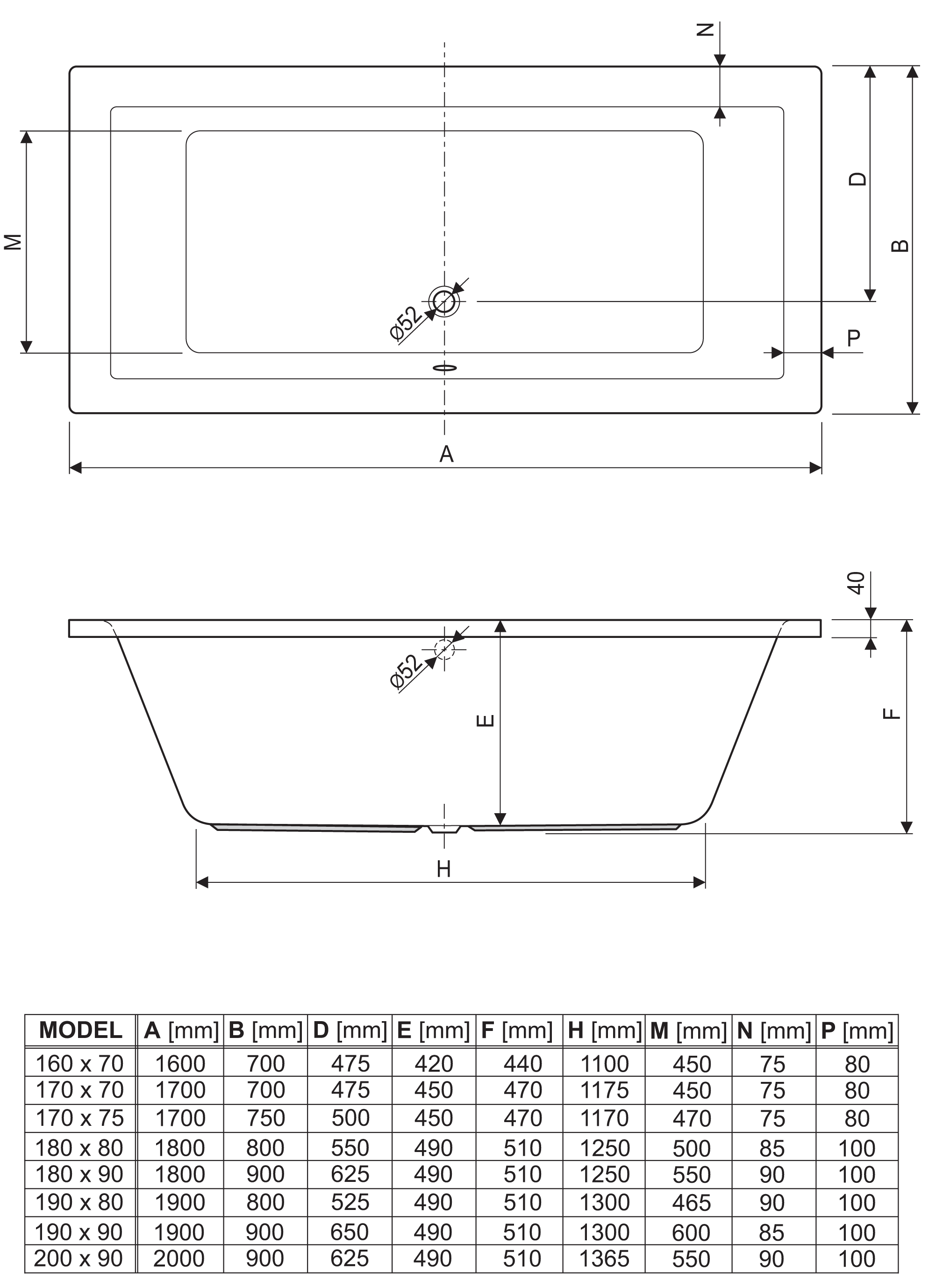 - 160 x 70 cm vol.200 ltr