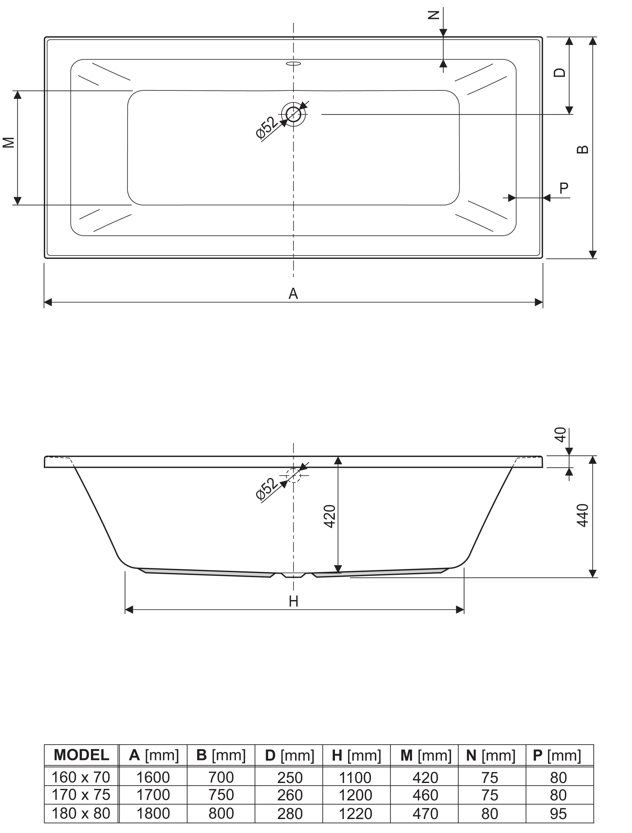 - 170 x 75 cm vol.220 ltr